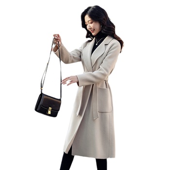 Gran oferta invierno mujer señora nuevo diseño personalizado moda Delgado largo doble cara Cachemira abrigo de lana, abrigo de piel de oveja con cuerda